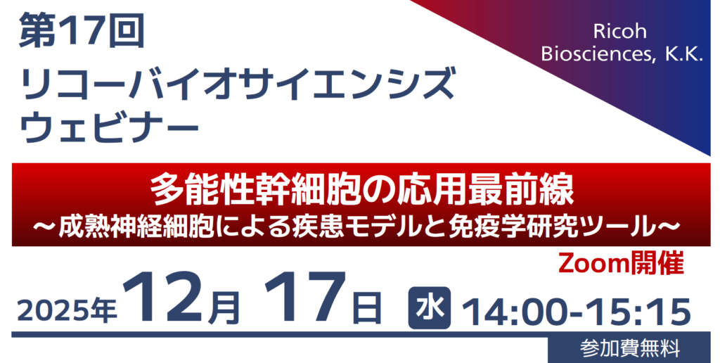 2025年12月17日(水)14:00より、第17回リコーバイオサイエンシズ ウェビナーを開催いたします。iPS細胞を応用した創薬研究は、細胞の「作製」から「高機能化」の時代へと進化しています。今回は、株式会社リコーとリコーバイオサイエンシズ株式会社において、当社の高速分化技術により実現した神経細胞の機能的成熟技術や、新たに開発を進める免疫細胞の最新成果をご紹介いたします。神経変性疾患のメカニズム解明・創薬研究に取り組む研究者様、再生医療分野や免疫学分野のツール探索に携わる研究者様は、是非ご参加ください。